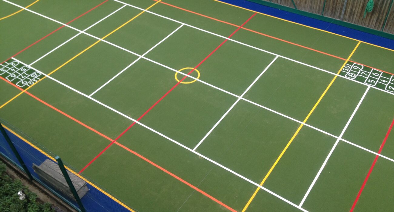 MUGA's have become popular for both Primary and Secondary Schools, Colleges and Universities. The nature of a MUGA enables a range of sports to be played on the surface, this allows for increased use of the area due to it's diverse nature and the area is playable all year round. The MUGA surface can also incorporate general play areas that can be used for younger children and outdoor teaching. Incorporating colours, shapes or logos allows for interactive play and teaching.